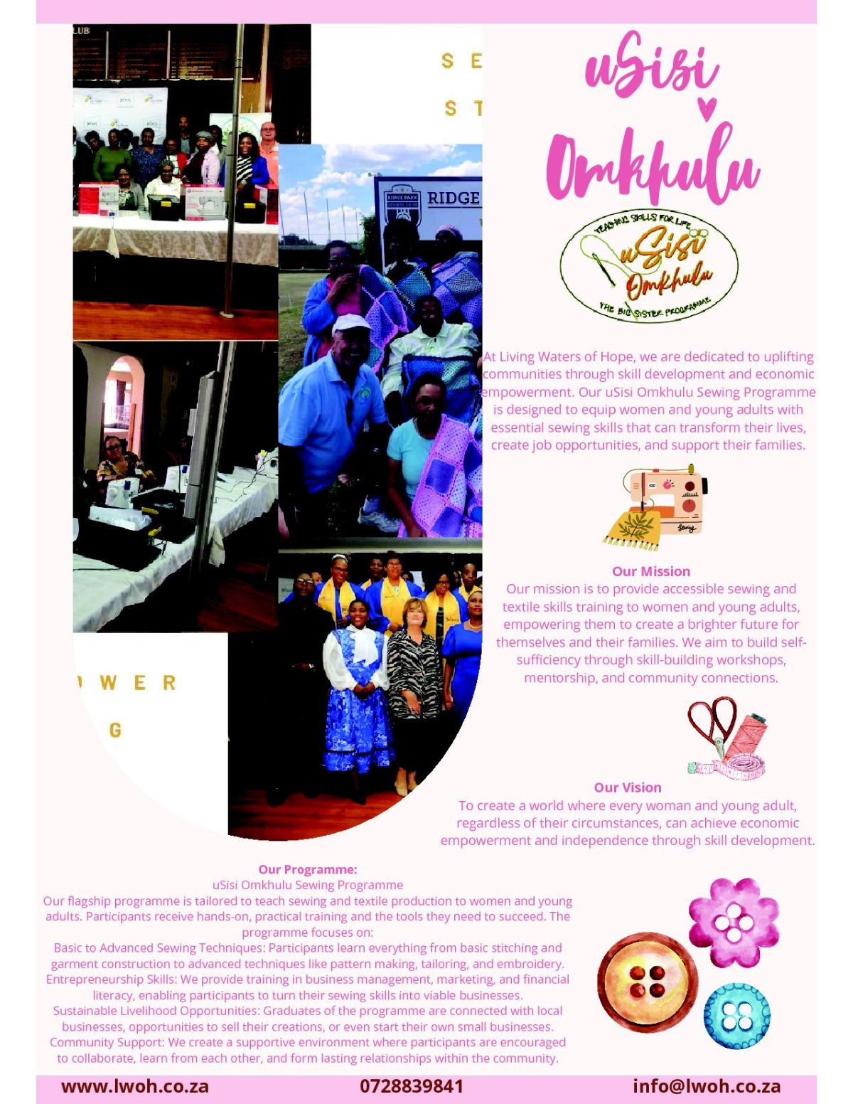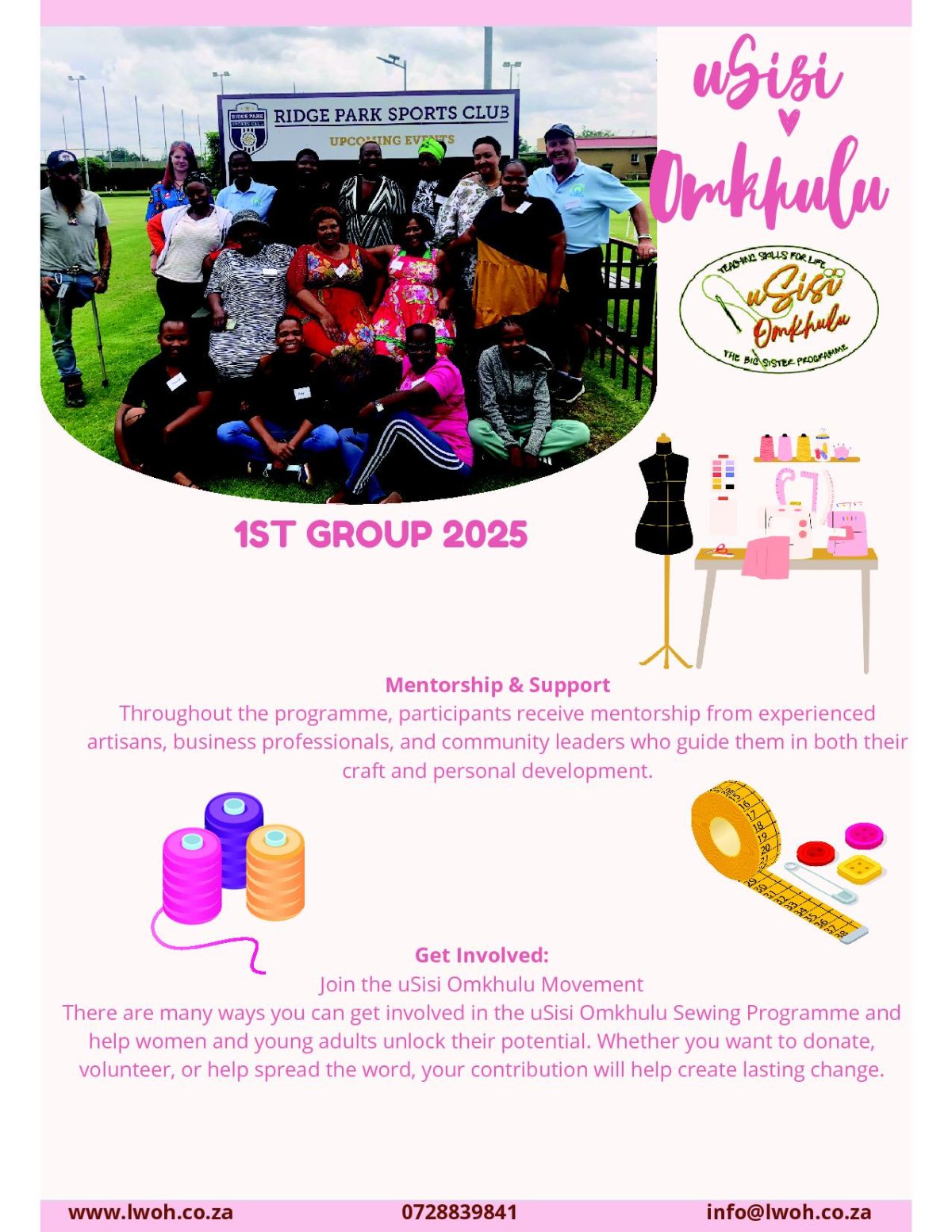 Furthermore, this skill can aid individuals with strong entrepreneurial instincts to pursue business ventures within these wings. industry, which this project uSisi Omkhulu seeks to achieve. uSisi Omkhulu, meaning Big Sister, is a name that provides a feeling of comfort and safety. Just as one would prefer to share concerning issues and worries with a big sister, this project aims to provide a nurturing environment to learn what better way to acquire sewing skills and techniques through this initiative than from the